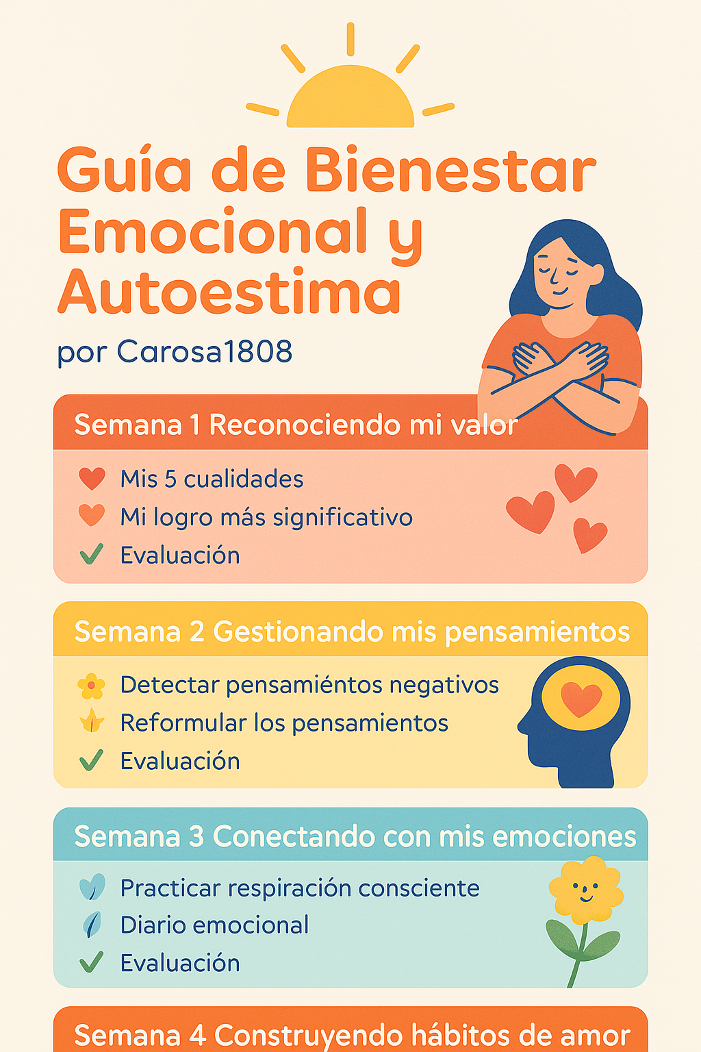 Transforma tu mundo interior en solo 4 semanas con la Guía Interactiva de Bienestar Emocional y Autoestima: 'Reconéctate Contigo Mismo/a' por Carosa1808. Esta herramienta digital interactiva, diseñada con amor y enfoque terapéutico, te acompañará en un viaje personal durante 4 semanas para ayudarte a reconocer tu valor, gestionar tus pensamientos y emociones, y construir hábitos sólidos de amor propio. Esta guía está pensada para que cualquier persona pueda usarla y beneficiarse de ella, sin importar su edad, género o situación actual. Descubre la claridad sobre quién eres y qué te hace valioso/a, combate pensamientos negativos y automáticos, integra hábitos de autocuidado a tu vida diaria, reconéctate con tu mundo emocional y aumenta tu autoestima real, sin promesas vacías. ¡Inscríbete ahora y comienza tu viaje hacia una vida más equilibrada y plena!